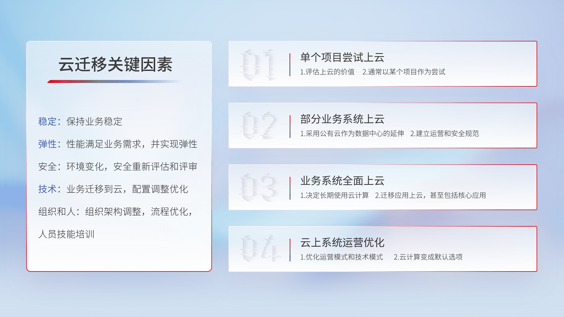 结合实际业务,,从规划设计、、、云平台选型、、、、云原生改造、、、数据迁移、、集成交付,,迁移全过程为客户识别最佳上云路径,,,做好风险识别管理,,,设计网络架构、、、、身份权限、、安全审计合规、、、、操作审计、、、日志审计、、、监控告警策略、、、、多站点容灾设计等,,对云上基础设施进行整体规划,,提升IT治理水平,,,以满足弹性、、、、高可用、、高性能的需求。。