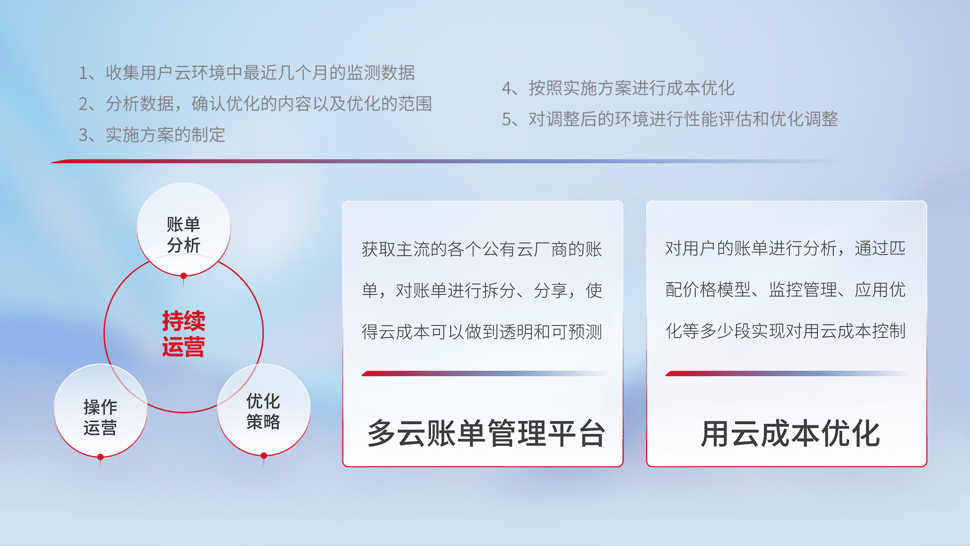 通过多云纳管,,,以统一的资源数据模型把客户的云资源进行抽象和封装,,,进而实现对多云资源的统一操作,,,,保障云资源管理的可靠性、、稳定性与可用性。。。量身定制化运维内容,,,配置、、、、开发运维、、、、补丁管理、、备份、、监控、、认证和访问管理、、审计和日常巡检等,,,,保障在用云过程中的可靠度,,稳定度以及高可用率。。。